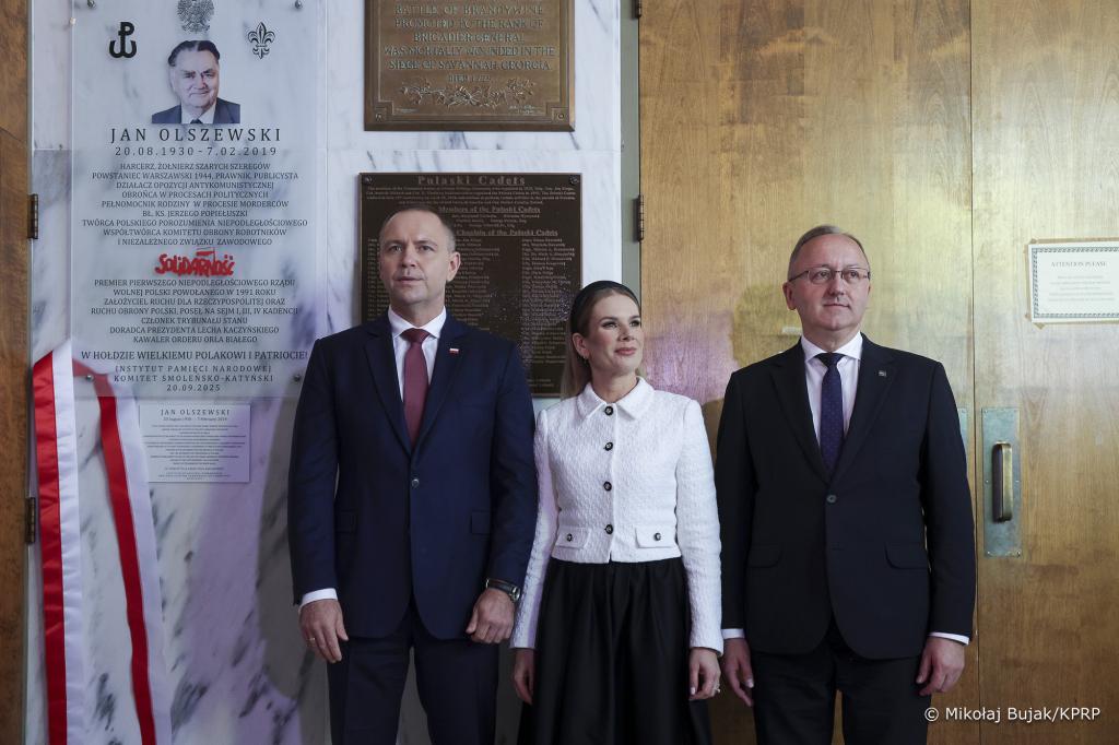 Wizyta Marty i Karola Nawrockich w sanktuarium rozpoczęła się od uroczystego odsłonięcia tablicy upamiętniającej śp. Premiera Jana Olszewskiego.